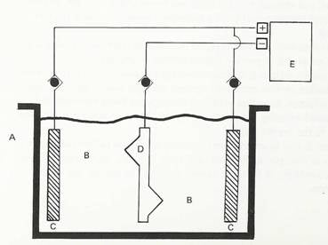 The plating solution “B” or electrolyte, is made from appropriate salts for the process being carried out and is of sufficient volume to cover all parts within the solution. Anodes “C” should also be covered by the solution and placed at opposing sides of the tank with at least 2 at opposite sides. The part to plated “D”, is immersed fully in the solution and placed equidistant from each anode. Power is supplied at “E” with positive anodes and the plated part “D” connected to the negative connection.